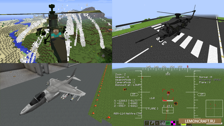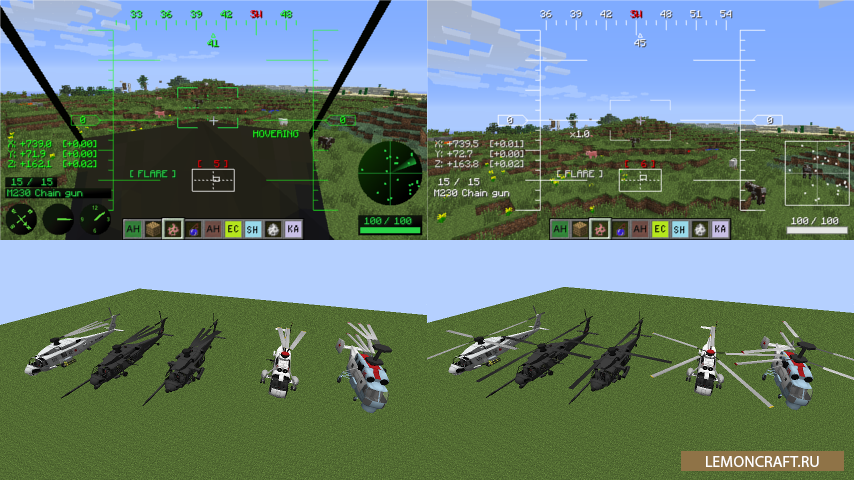 Китайские разработчики поражают изобретательностью. Мод на вертолёты для Майнкрафт 1.7.10/1.7.2/1.6.4 - MCHeli позволяет создавать летательный транспорт в игре. Отличается он необыкновенно качественными и детализированными моделями. Это не простые коробки с пропеллерами, а полноценные вертолёты с обтекаемым корпусом, мелкими деталями, вместимость в несколько игроков и реалистичным интерфейсом.